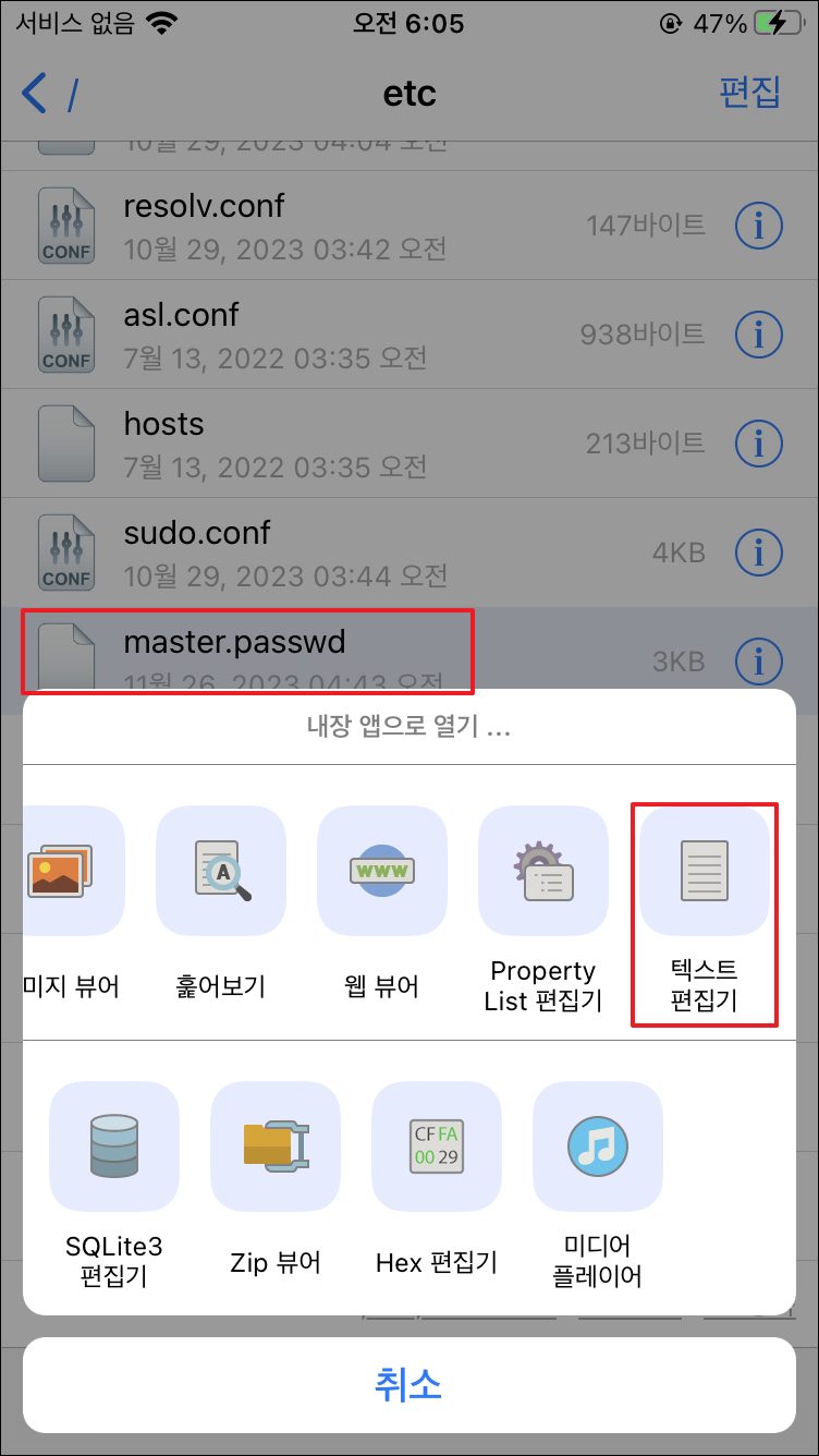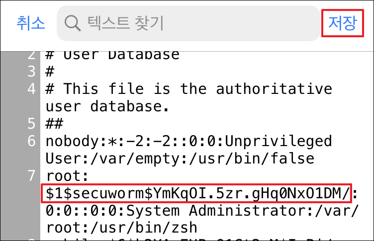 Filza 에서 /etc/master.passwd 파일을 텍스트편집기로 오픈한다.