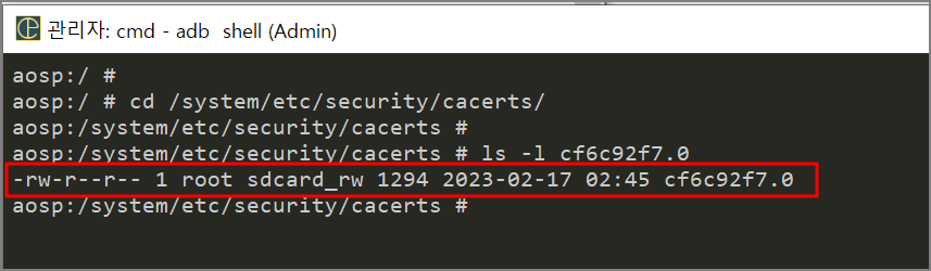 연결된 Android 단말기의 시스템 인증서 경로인 '/system/etc/security/cacerts/' 에 인증서를 삽입하는 부분이다.