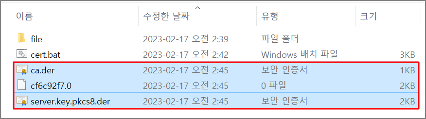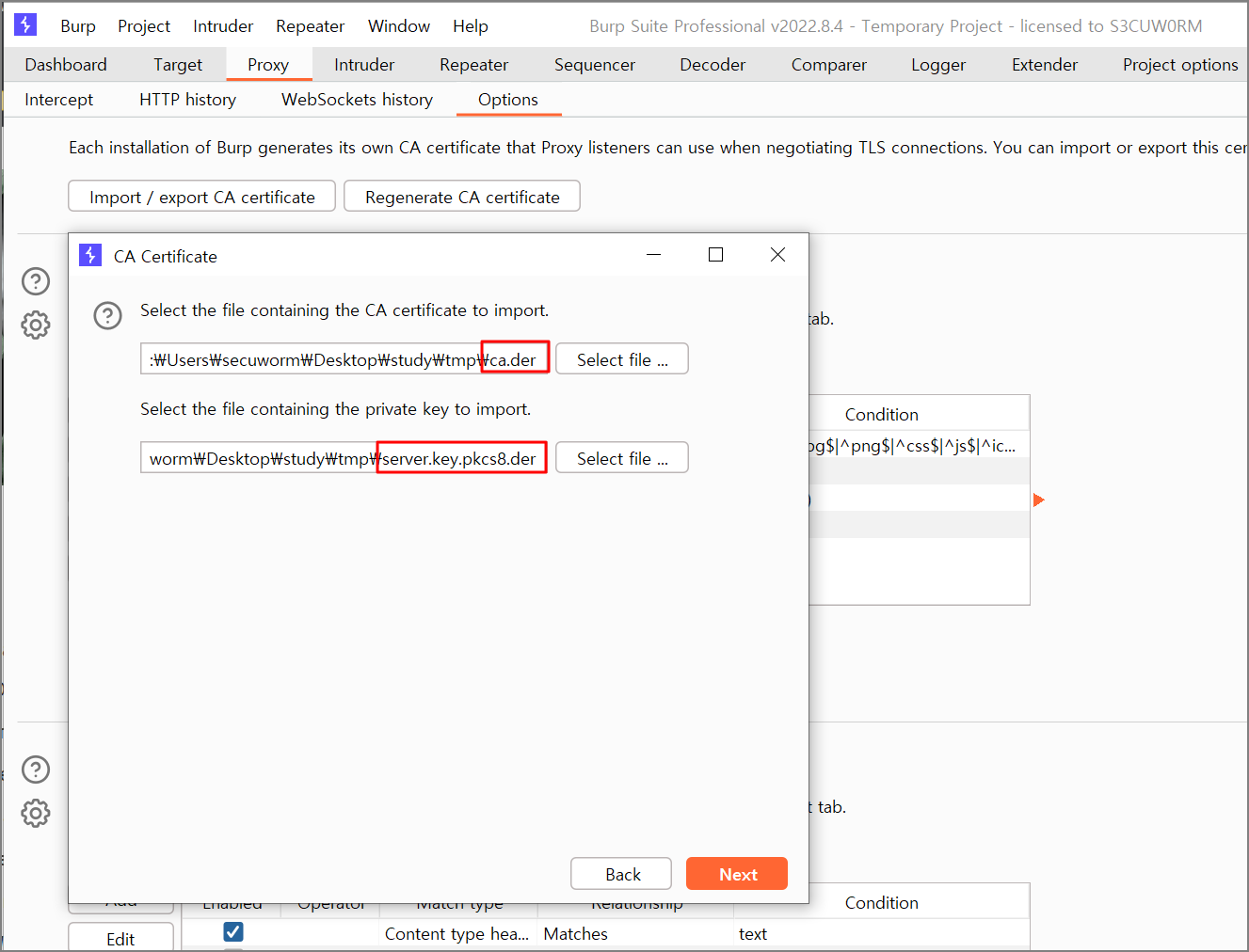 스크립트 실행 후, 해당 경로에 파일 3개가 생성된다. 이 중 ca.der 과 server.key.pkcs8.der 은 Burp Suite> Proxy> Options> Import/export CA certificate>Import> Certificate and private key in DER format 위 경로에 각각 수동으로 Import 시켜야 한다.