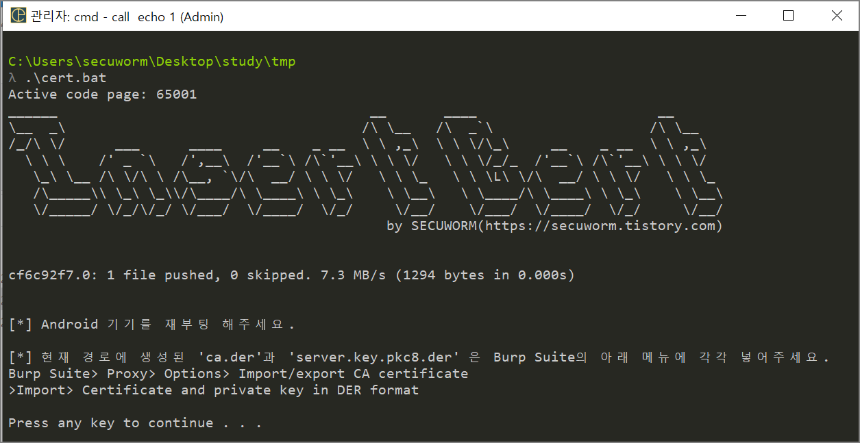 모든 동작 후, Android 기기 재부팅 및 인증서 파일을 Burp Suite에 Import 시켜달라는 메시지와 함께 스크립트가 종료된다.