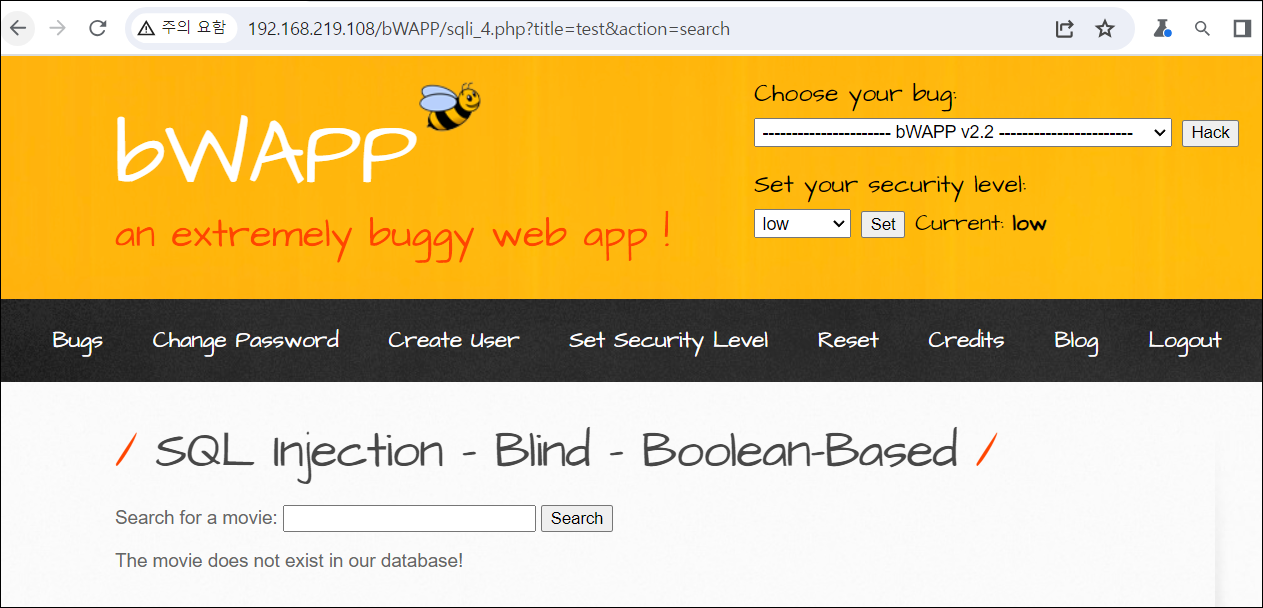 테스트는 비박스의 SQL Injection - Blind - Boolean-Based 를 대상으로 수행했다.